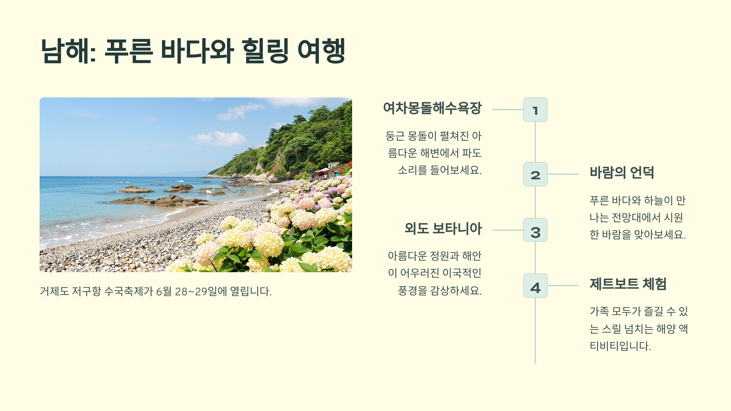 6월은 남해가 가장 푸르고 평화로울 때라서, 복잡한 일정 없이도 쉼표 같은 여행을 만들 수 있어요. 대도시에서는 느끼기 어려운 정적인 힐링이 필요한 사람이라면 남해가 정답이에요. 🛶