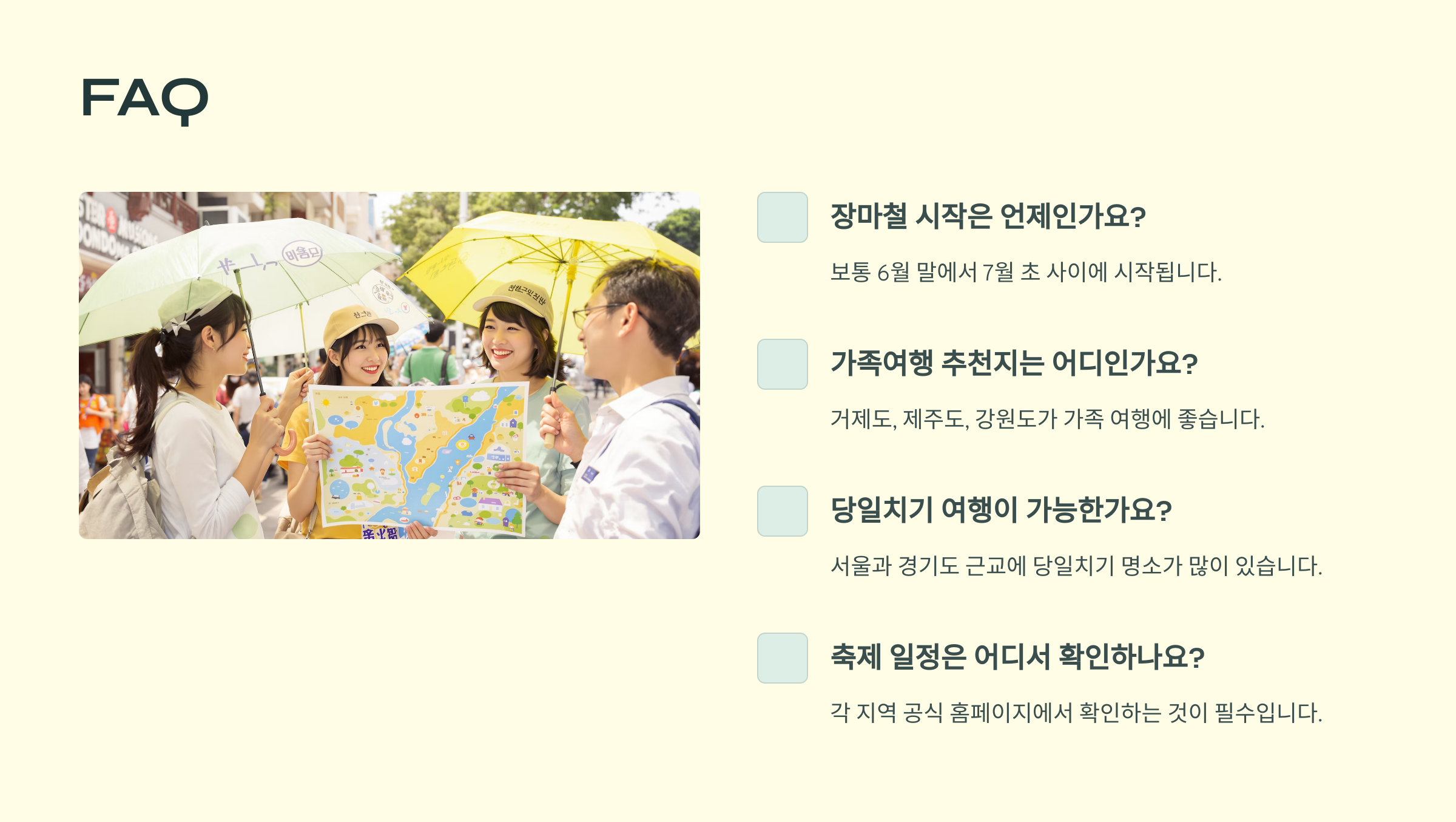 A2. 네! 6월 중순부터 해수욕장이 개장해요. 다만 수온이 낮을 수 있으니 얕은 곳에서 조심스럽게 즐기는 걸 추천해요.