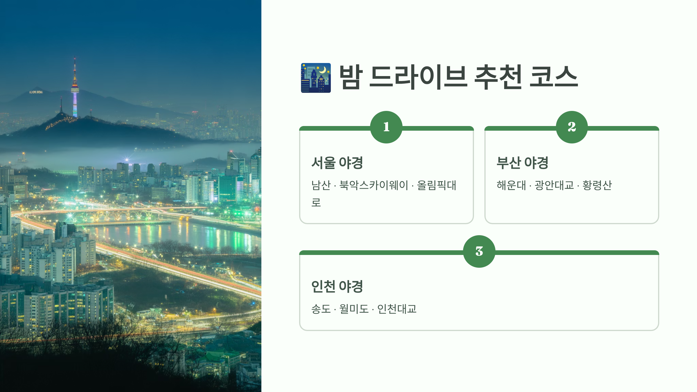 서울에서 추천되는 대표 코스는 ‘남산순환로’, ‘북악스카이웨이’, ‘올림픽대로 야경 라인’이에요. 도심과 한강의 불빛을 동시에 즐길 수 있어서 밤 드라이브 입문 코스로 제격이에요. 여름밤의 바람을 맞으며 도로를 달리면 하루의 피로가 눈 녹듯 사라져요.
