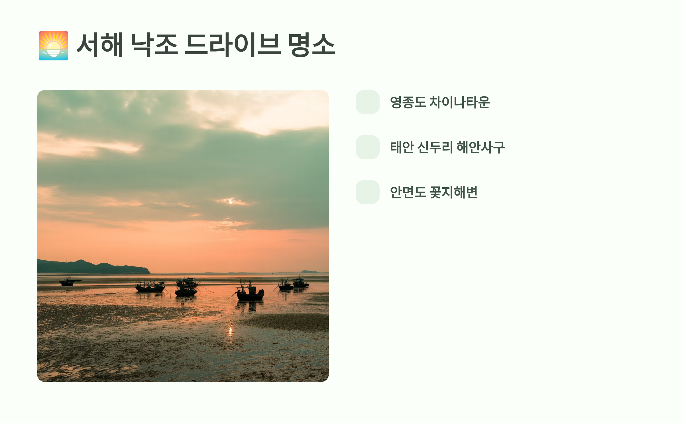 서해 드라이브는 일몰 직전에 도착하는 게 포인트예요. 낮에는 근처 수목원이나 해변을 둘러보고, 저녁 무렵에는 낙조 포인트로 이동하면 하루 코스가 완성돼요. 여유 있게 음악 들으며 서해의 늦은 오후를 달려보세요 🎶