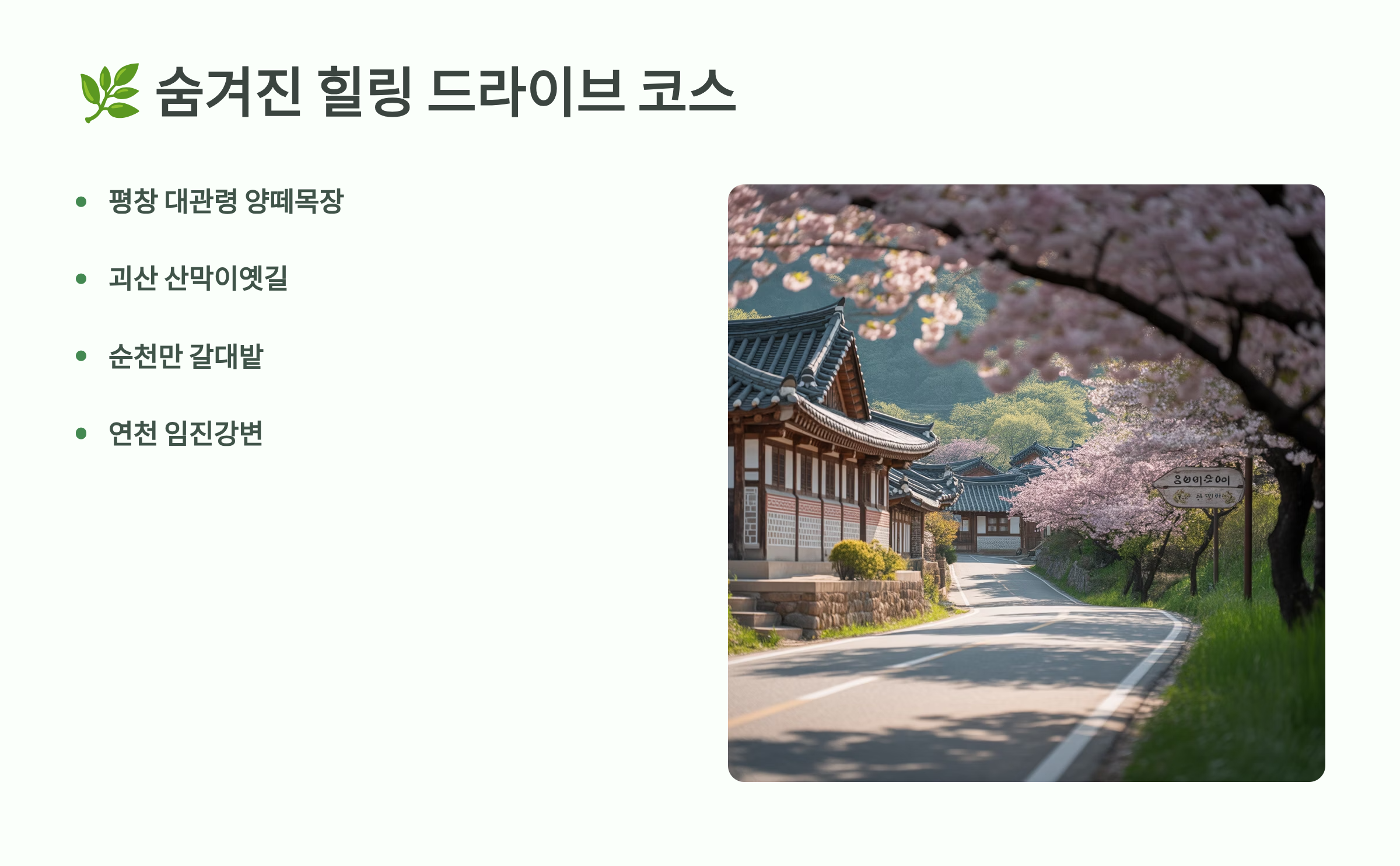 사람이 붐비지 않고, 고요한 자연과 마주하며 차분히 달릴 수 있는 길을 원한다면 ‘숨은 드라이브 코스’가 제격이에요. 지도에 표시된 유명 명소가 아니더라도, 오히려 그런 조용한 길에서 진짜 힐링이 시작되죠.