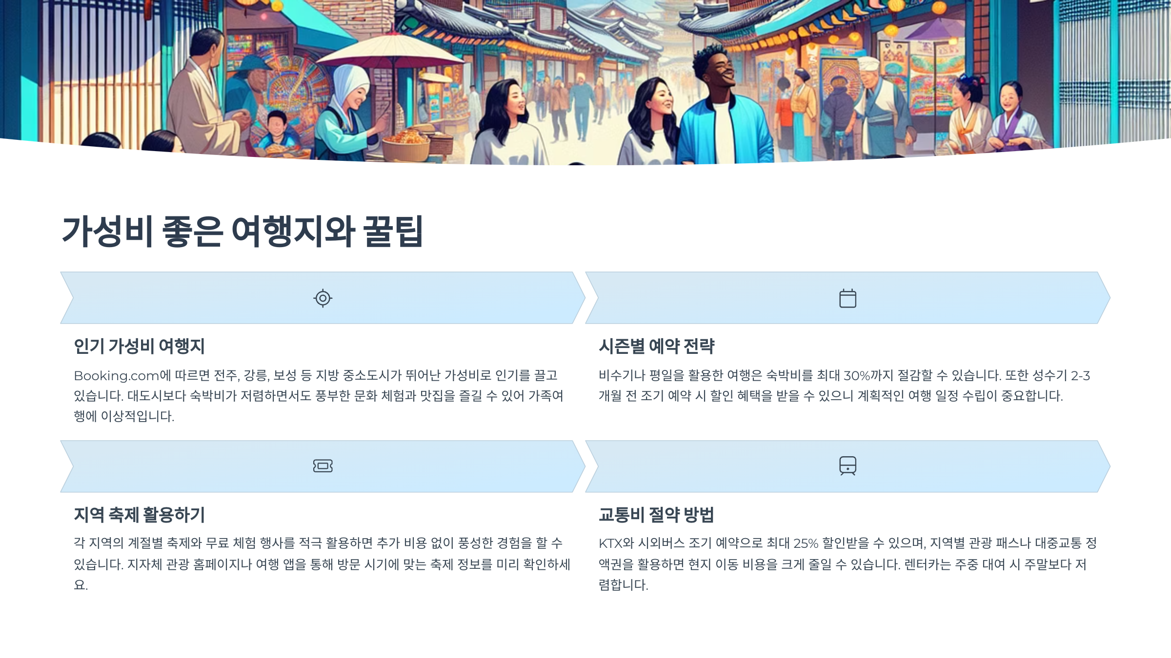 가족여행은 인원이 많다 보니 비용이 부담될 수 있어요. 그래서 숙소, 식사, 입장료 등을 합리적으로 조율할 수 있는 '가성비 여행지'를 찾는 게 중요해요. 특히 지방 소도시나 지자체가 운영하는 체험 프로그램을 활용하면 훨씬 경제적이에요.