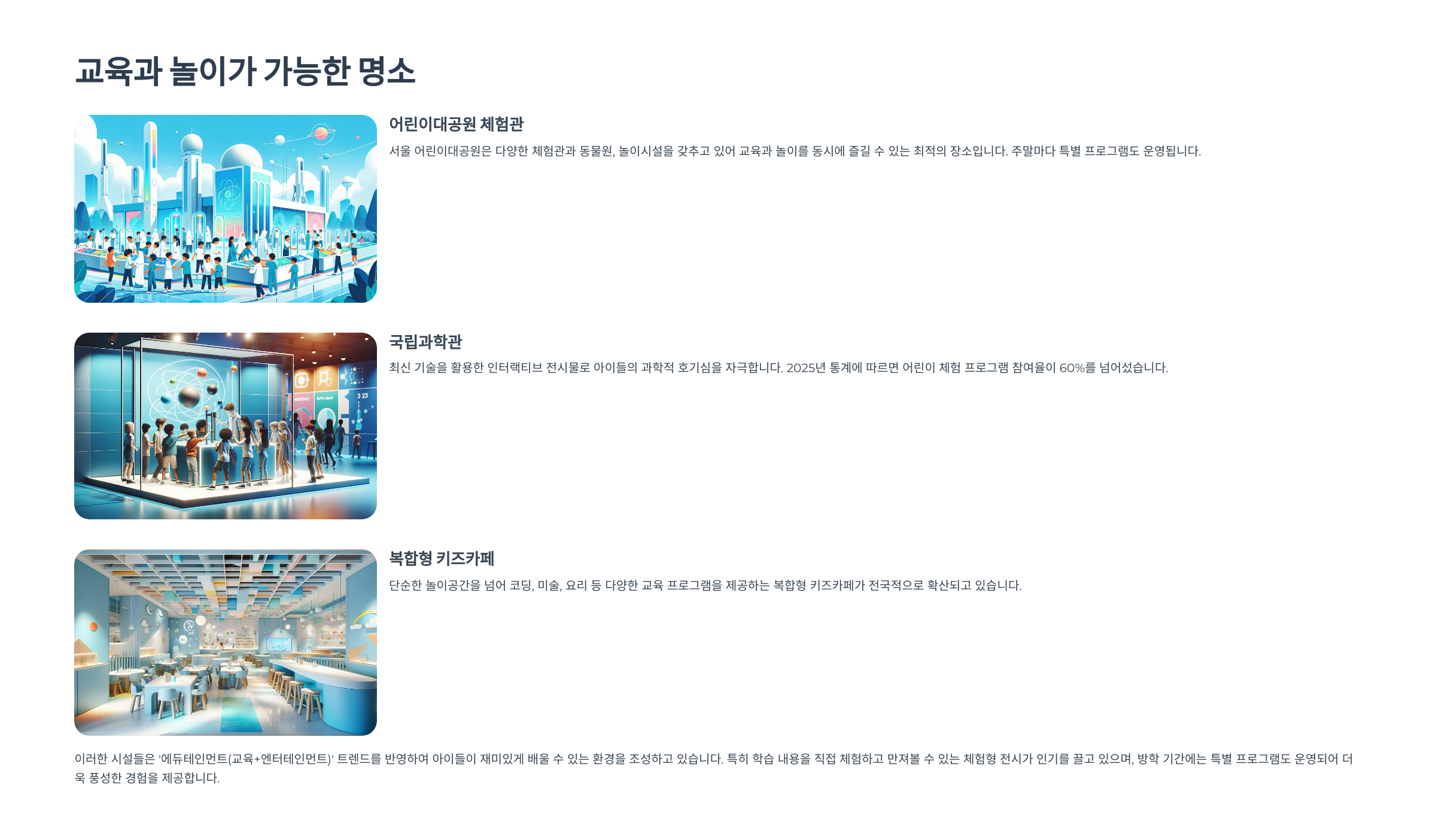 이런 명소들은 놀이와 학습이 자연스럽게 연결되기 때문에, 아이들도 흥미롭게 참여하고 부모들도 교육적으로 만족할 수 있어요. 🧠